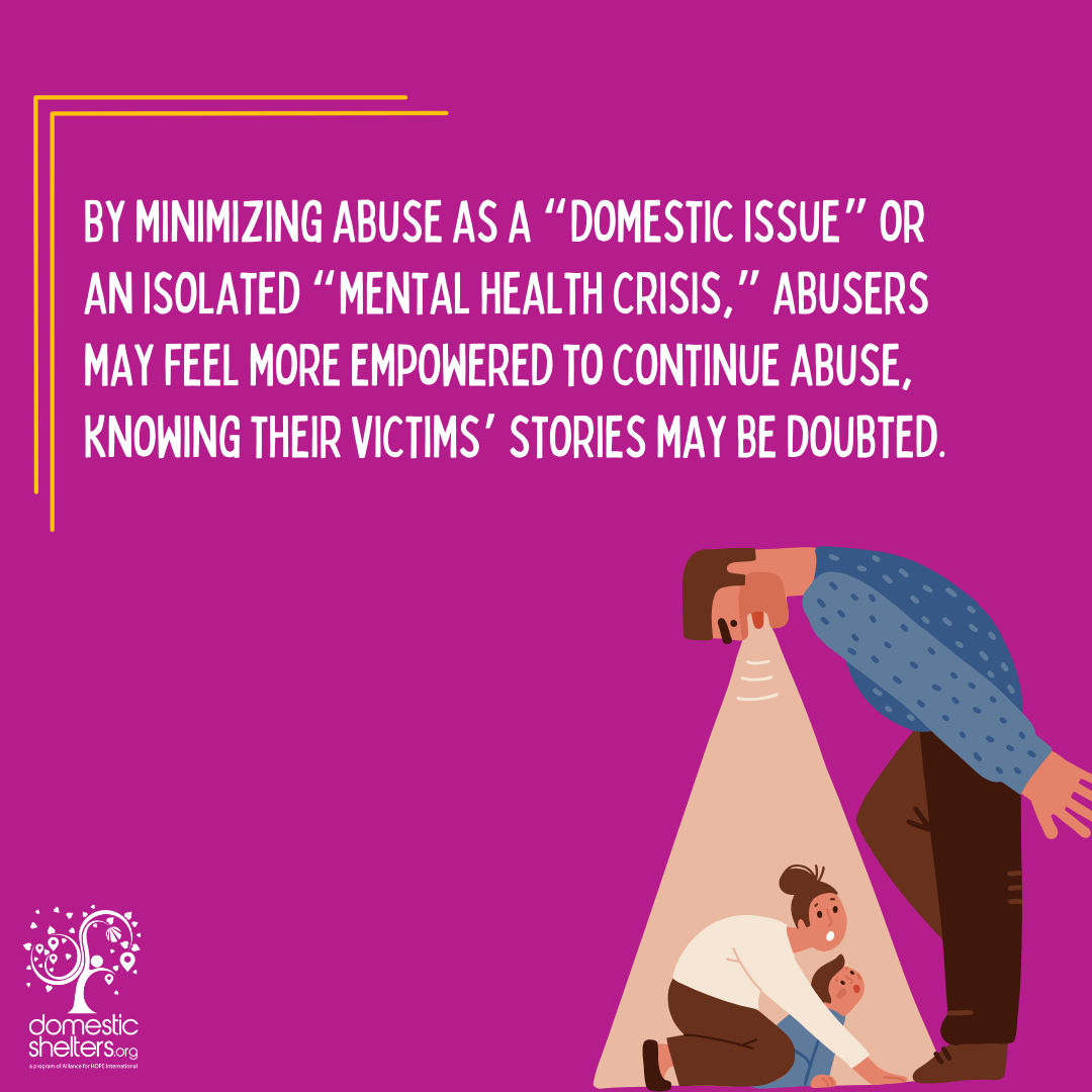 By minimizing abuse as a “domestic issue” or an isolated “mental health crisis,” abusers may feel more empowered to continue abuse, knowing their victims’ stories may be doubted. It may very well boil down to ignorance among those who’ve never been subjected to abuse by a partner, or who endure it and believe others can or should do the same.