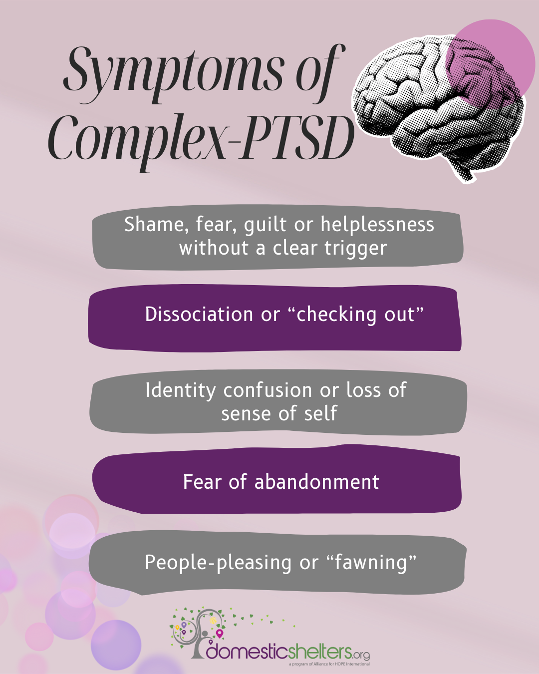 Many domestic violence survivors experience the long-term abuse or coercive control that can lead to CPTSD. Symptoms may include: